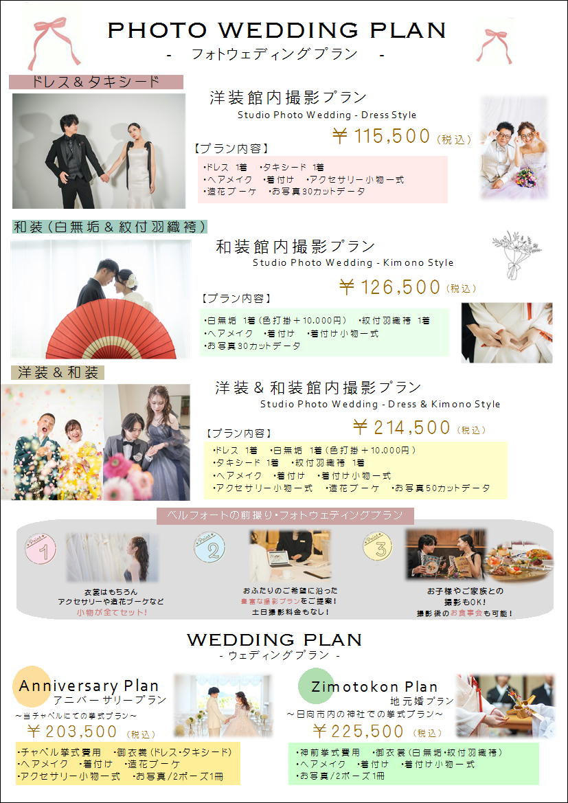 このほかにも様々なウェディングプランを用意しております。ご相談、お問い合わせ等ございましたら、お気軽にホテルベルフォート日向婚礼部までどうぞ。